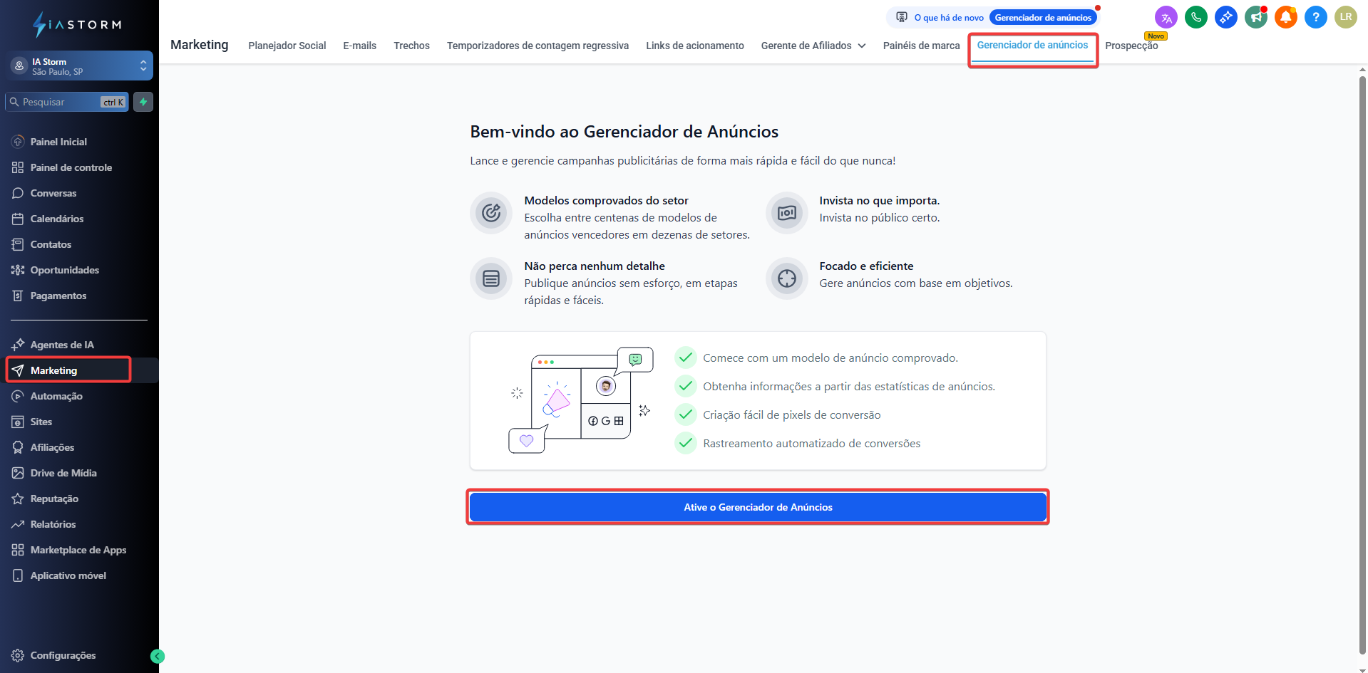 Navegue no menu lateral até Marketing, vá até a seção de "Gerenciador de anúncios" e clique em "Ativar Gerenciador de Anúncios"