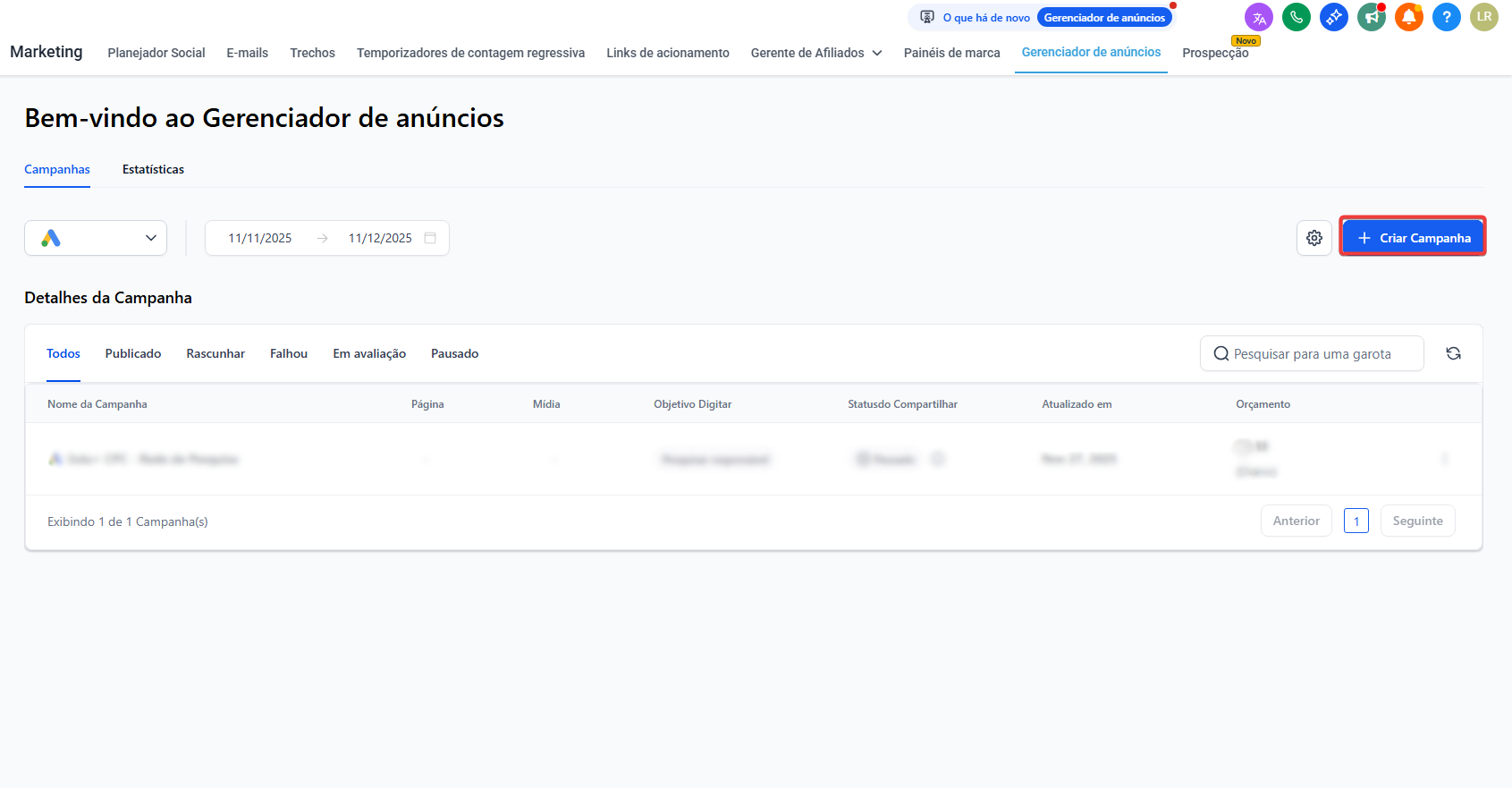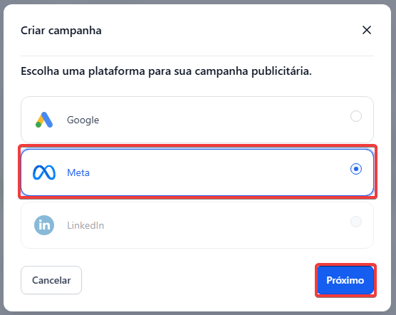 Escolha em qual plataforma a campanha vai rodar e clique em "Próximo"