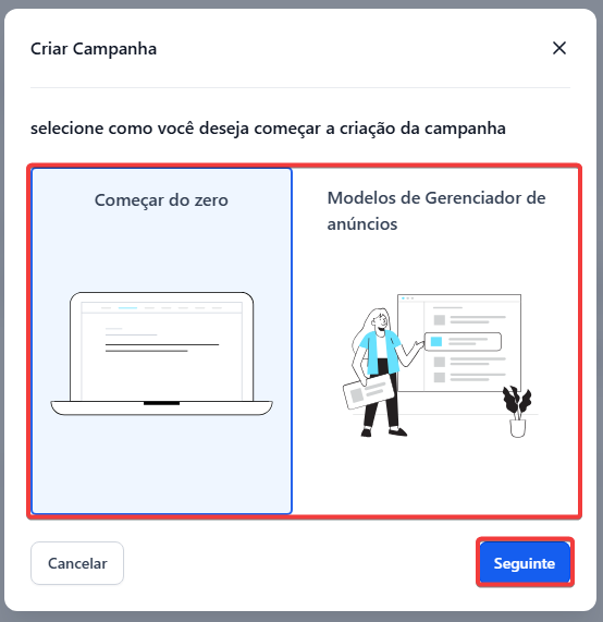 Escolha como irá iniciar a campanha, do zero ou a partir de modelos disponíveis e clique em "Seguinte"