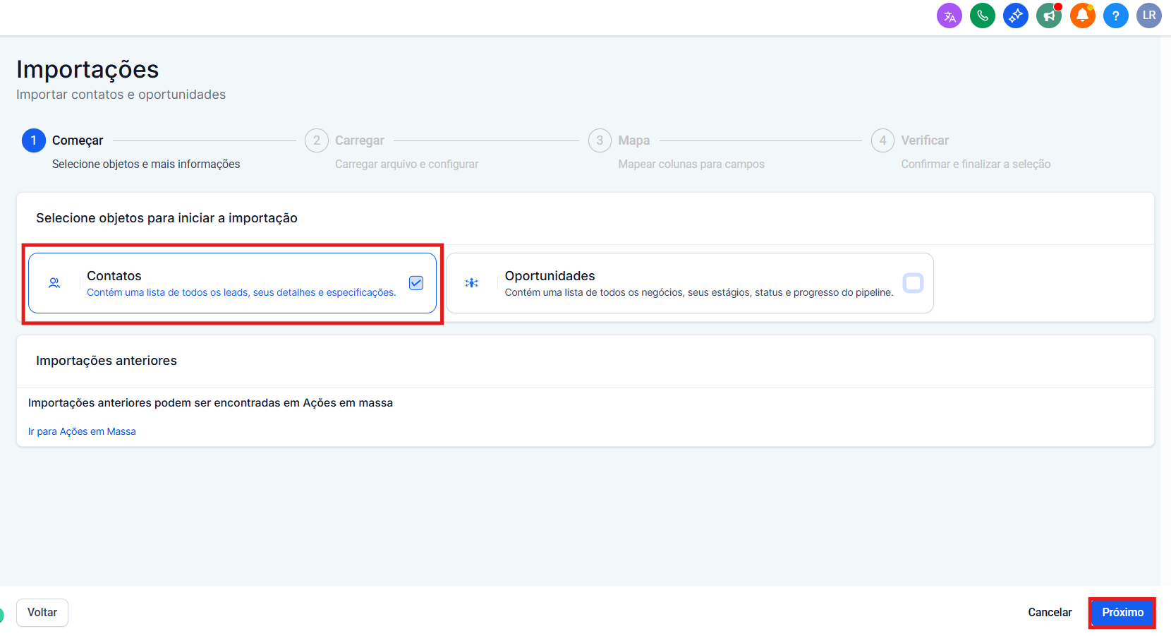 1. Em Importações, selecione "Contatos" e clique em "Próximo".