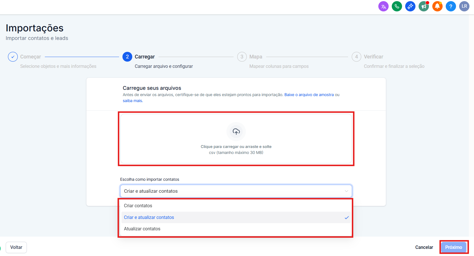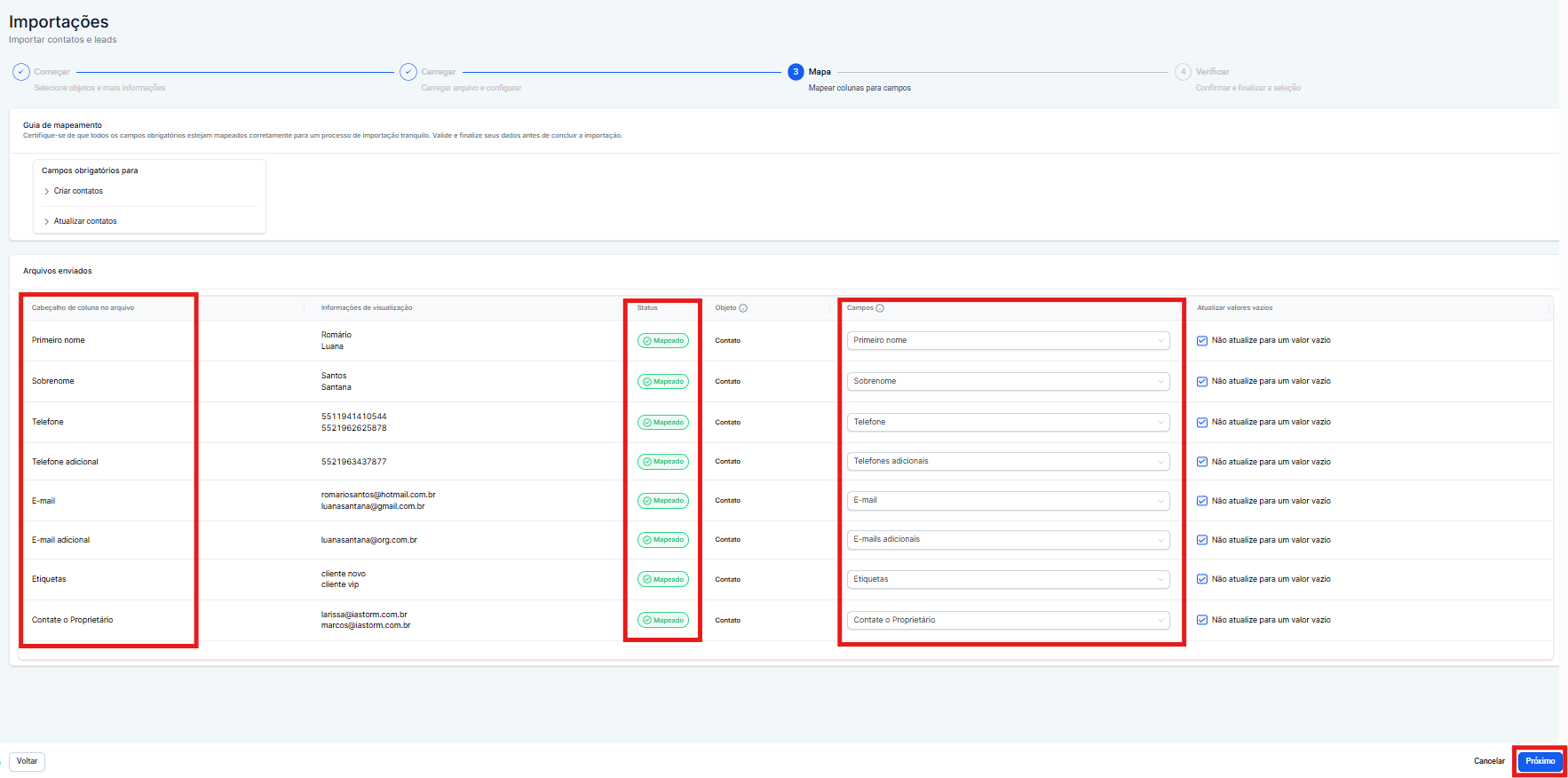 1. Mapeie as colunas do arquivo para os campos de contato correspondentes. Se houver algum dado não padrão, crie um novo campo personalizado. Ou selecione "Não importar dados em colunas não correspondentes" (importante informar que clicando nessa opção, a coluna em questão não será reconhecida, portanto, as informações contidas nela não vão refletir no CRM). Finalizando esse processo clique em "Próximo".