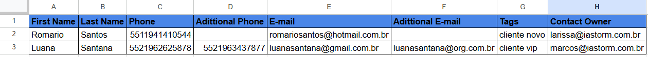 Segue um exemplo de arquivo CSV que é aceito com sucesso na plataforma: