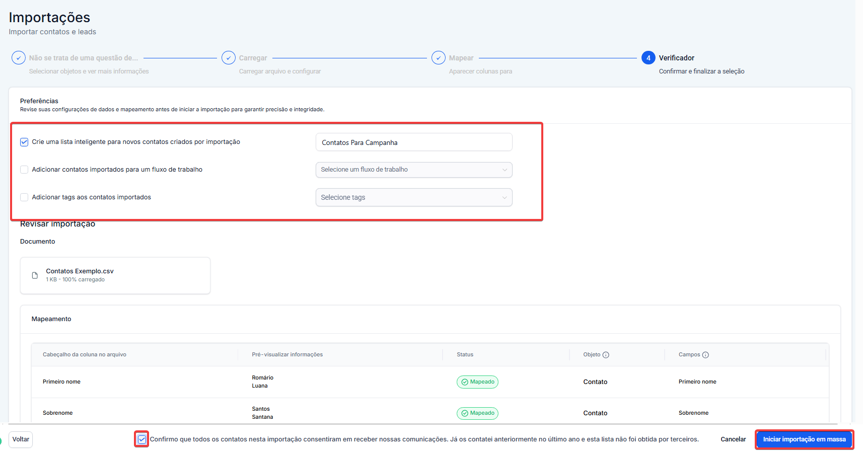 1. Preencha os detalhes da importação (nomeie, crie listas, etc.), aceite o termo de consentimento e clique em "Iniciar importação em massa".