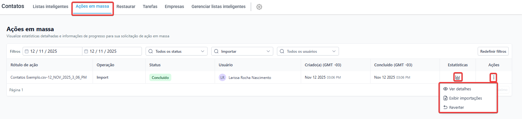 1. Aguarde a conclusão da importação dos contatos. É possível acompanhar o andamento na aba de "ações em massa" ainda na seção de contatos.