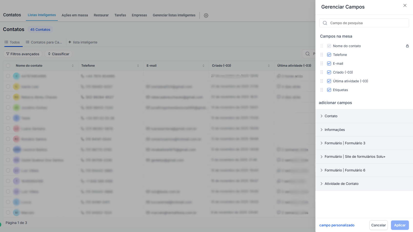 Clique no botão "Gerenciar Campos", fica localizado no canto superior esquerdo da tela ao lado de uma engrenagem. Marque ou desmarque as caixas para incluir ou excluir colunas específicas na exportação.