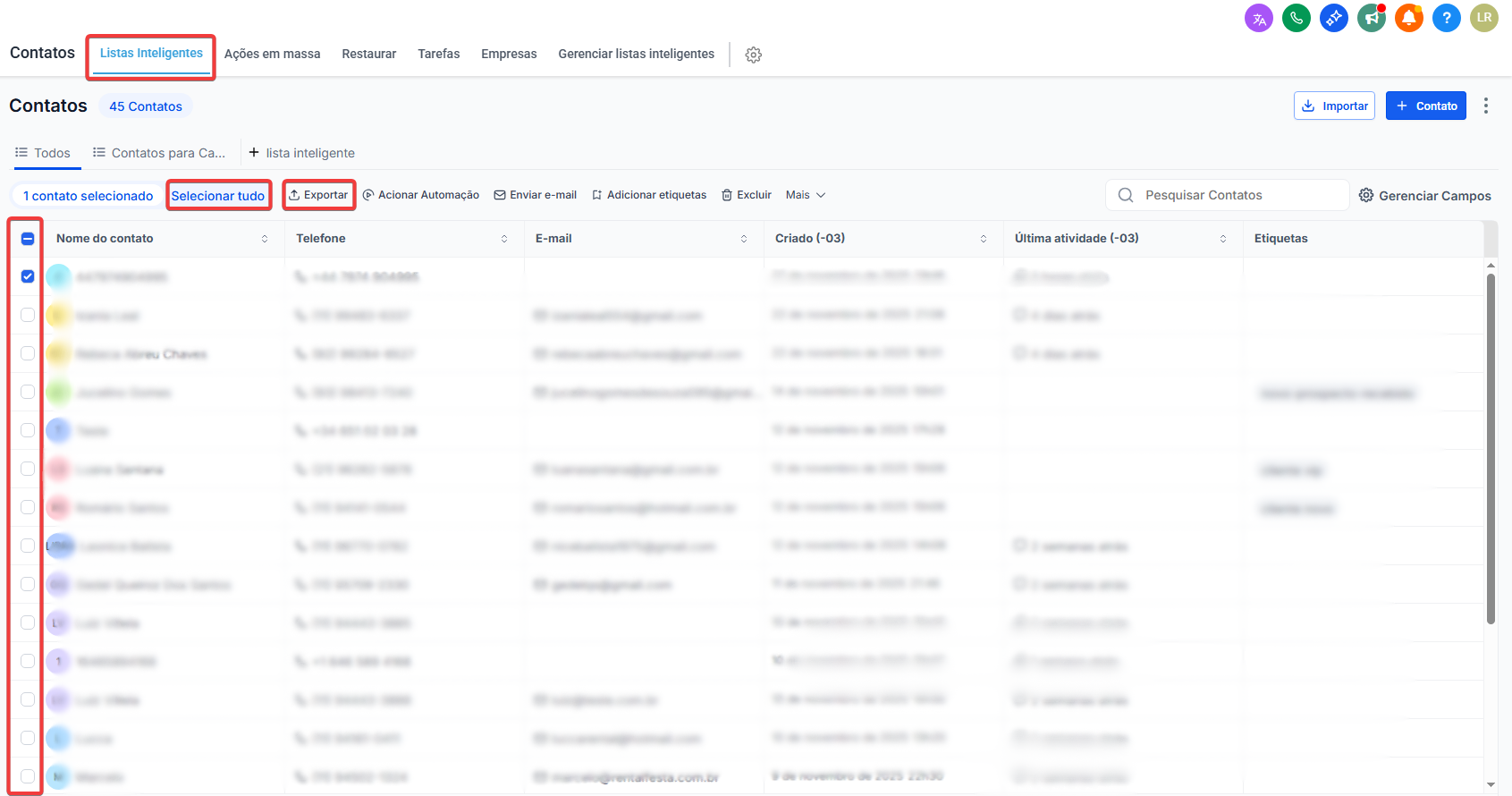 Se a exportação for apenas de um grupo específico de contatos (por exemplo, leads de uma campanha específica ou clientes de uma determinada localização), use as opções de filtros avançados para refinar a lista (é possível localizar essa opção na imagem acima, ao lado de um ícone de funil). Caso contrário, é possível exportar todos os contatos de uma só vez.