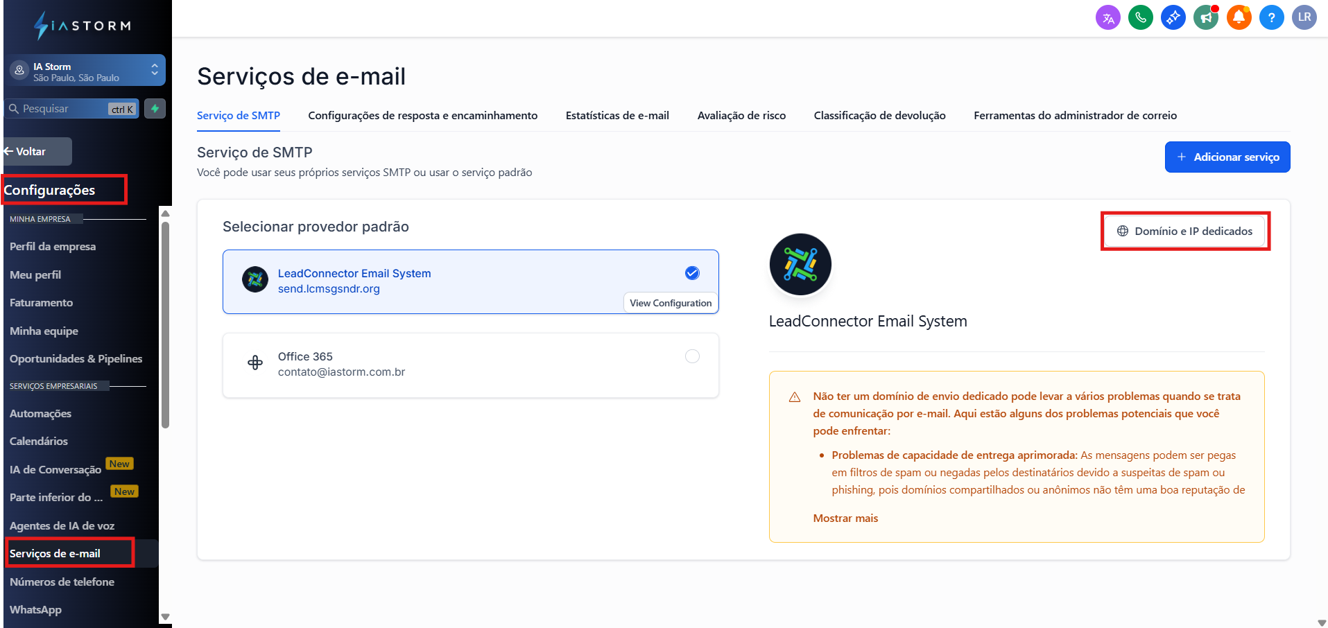2. Clique em "Domínio e IP dedicados"