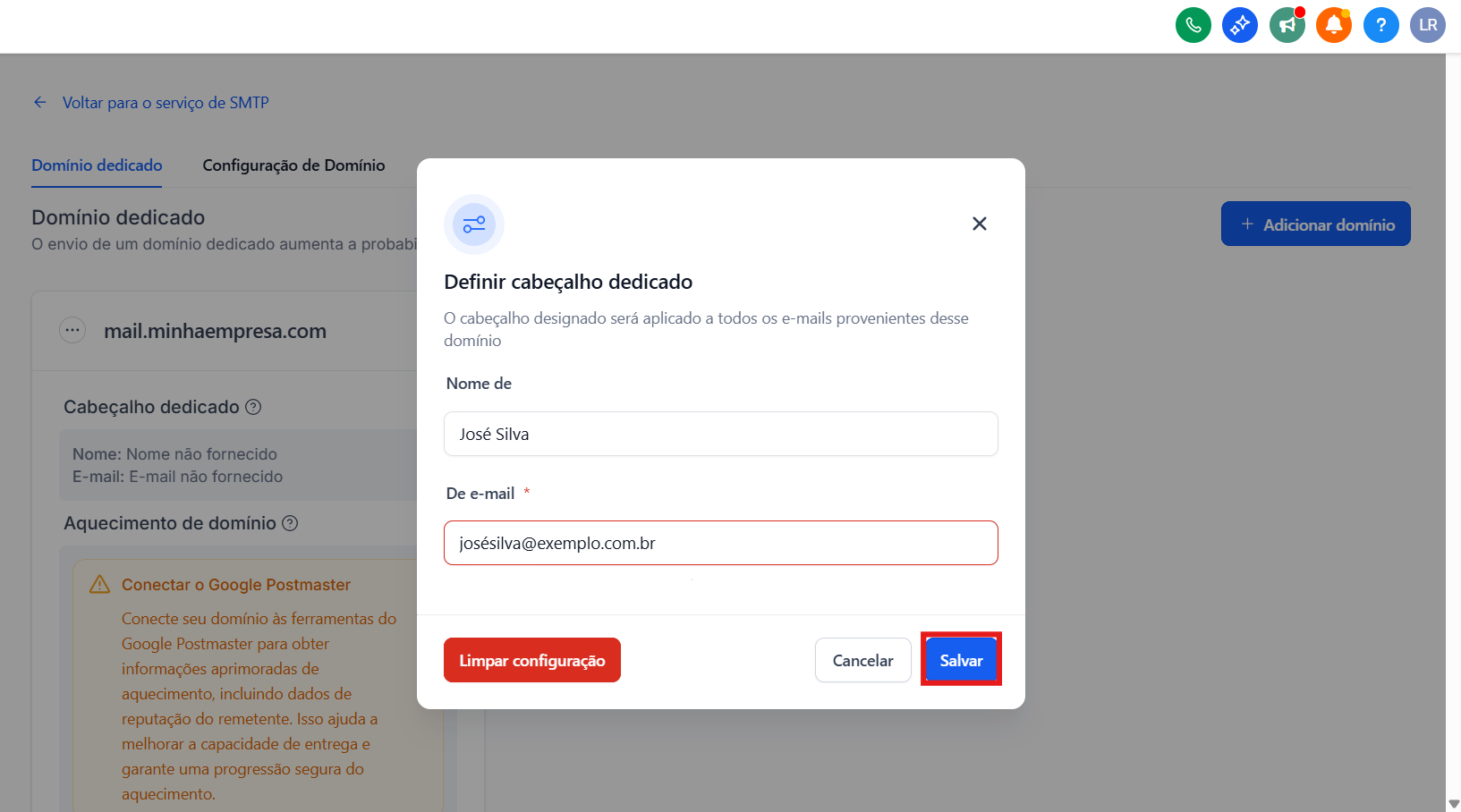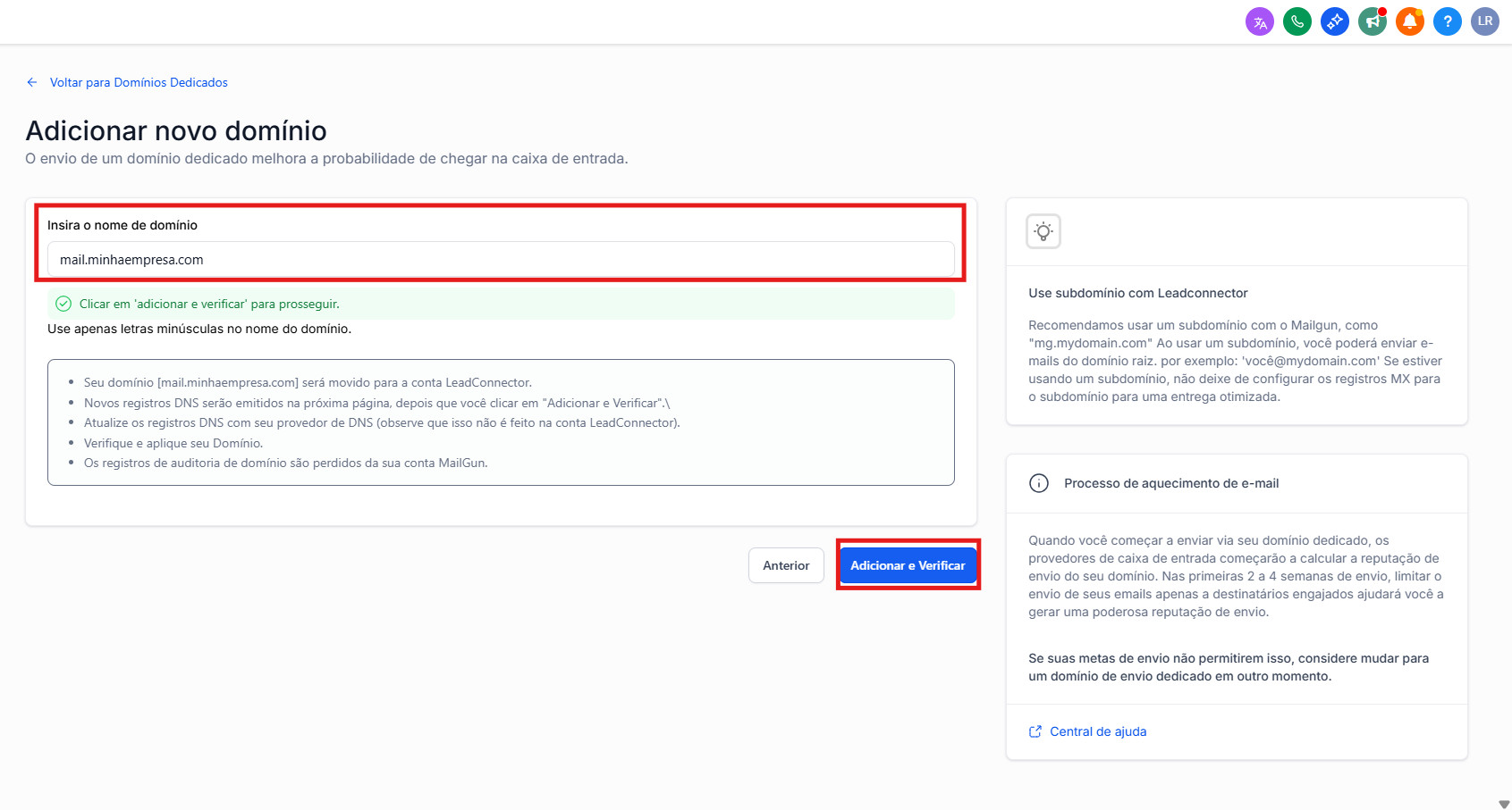 • Insira um prefixo de subdomínio junto com seu domínio (por exemplo, mail.minhaempresa.com)