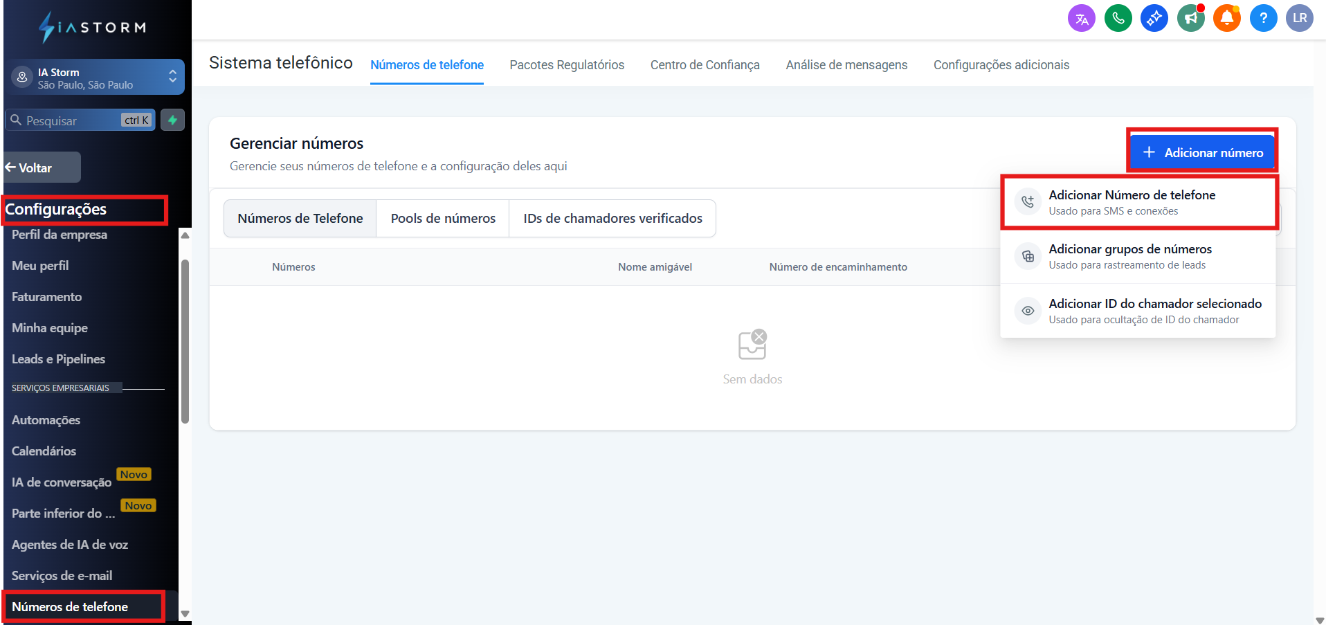 2. Clique em "+ Adicionar número" e em seguida selecione a opção "Adicionar número de telefone"